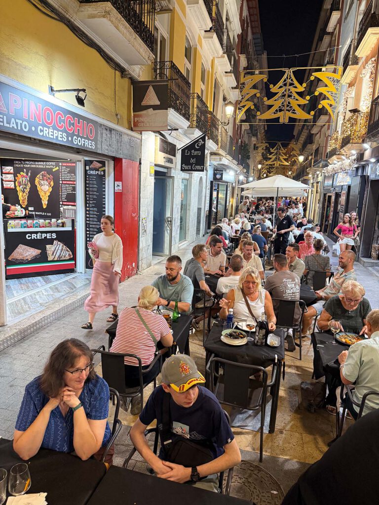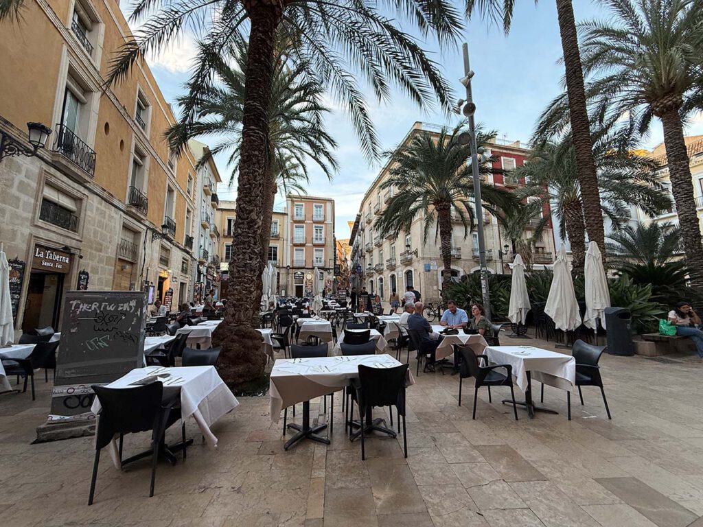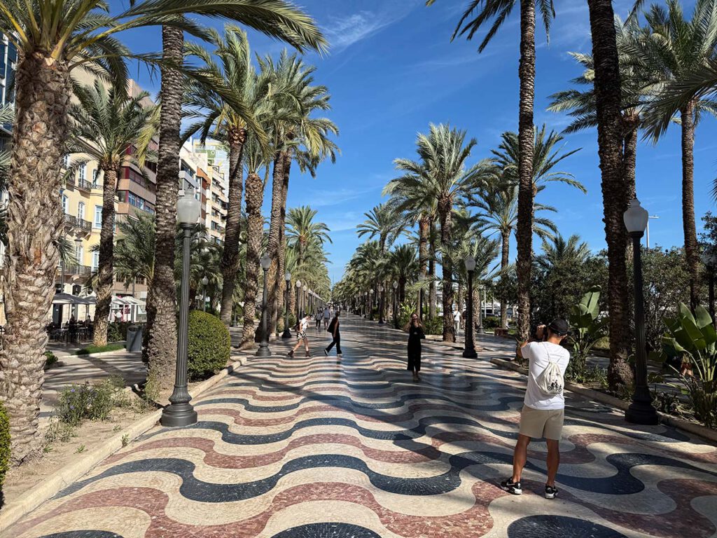 The “old center” is full of restaurants and bars. Narrow streets, lively atmosphere, outdoor dining and drinking. Strolling along the Paseo de la Explanada boulevard, with its mosaic floor and stately palm trees, the city beach, and last but not least, very very pleasant weather and plenty of sunshine.